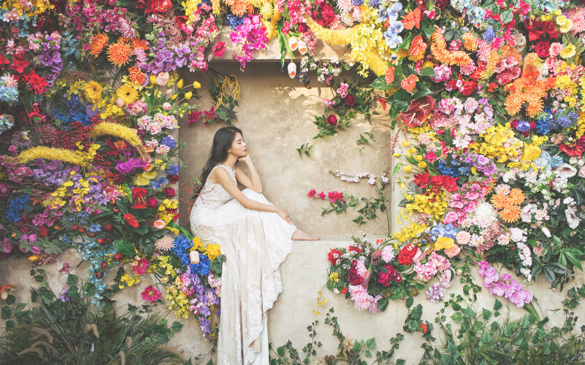 本物志向の豪華な建造物や満開の花々が世界観を生みだします。