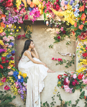 本物志向の豪華な建造物や満開の花々が世界観を生みだします。