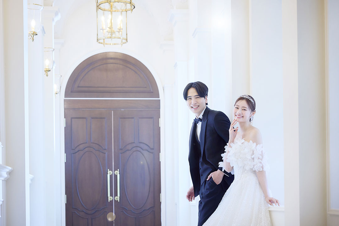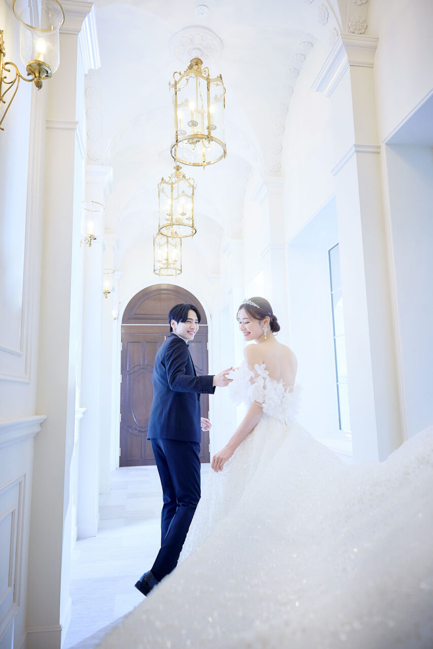 高い天井にシャンデリアが輝き、 アーチ状の長い廊下が奥行きのある美しい構図を生み出します。新郎新婦が後ろ姿で歩くショット、 柔らかい自然光に包まれたロマンティックなカット。どんなシーンも上品で洗練された仕上がりに。